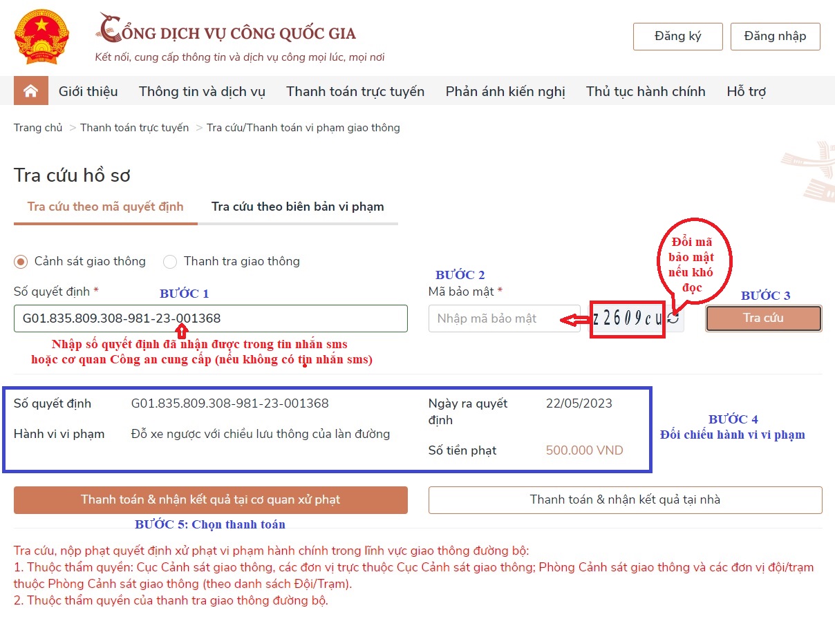 – Nhập số quyết định đã được dịch vụ công gửi về tin nhắn sms (G01.835.809.308-981-23-0001368) nếu công dân chưa cung cấp số điện thoại để thì đề nghị Cán bộ Cảnh sát giao thông cung cấp số quyết định xử phạt của mình hoặc có thể tra cứu theo Biên bản vi phạm hành chính.