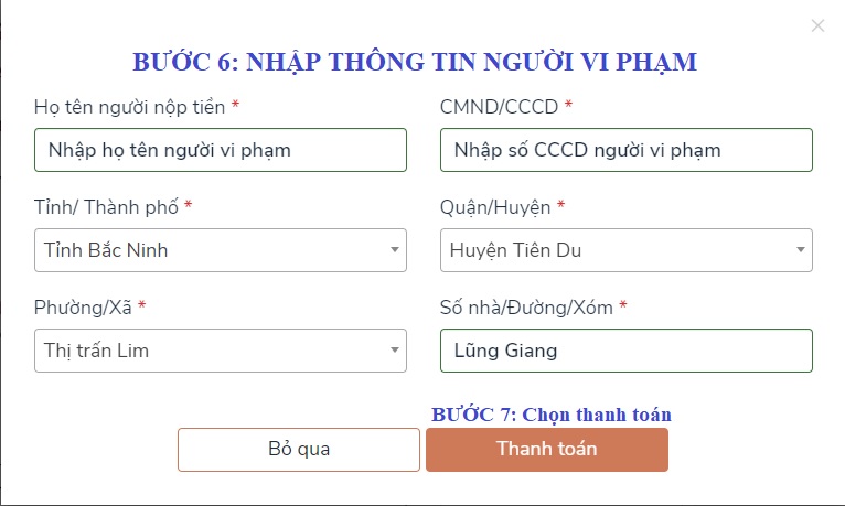 – Công dân nhập đầy đủ thông tin cá nhân theo hướng dẫn sau đó chọn thanh toán