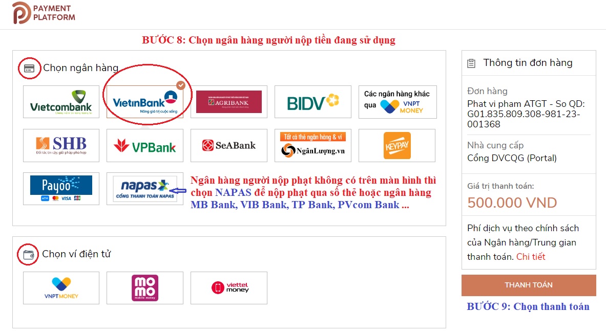 khi đã chọn được ngân hàng thích hợp công dân bấm chọn Thanh Toán